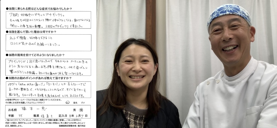 急性な腰痛と1か月前くらいから続く膝痛が、整体を受けて数日過ぎるとツライ痛みが楽になり、日常生活の痛みもなくなりました。