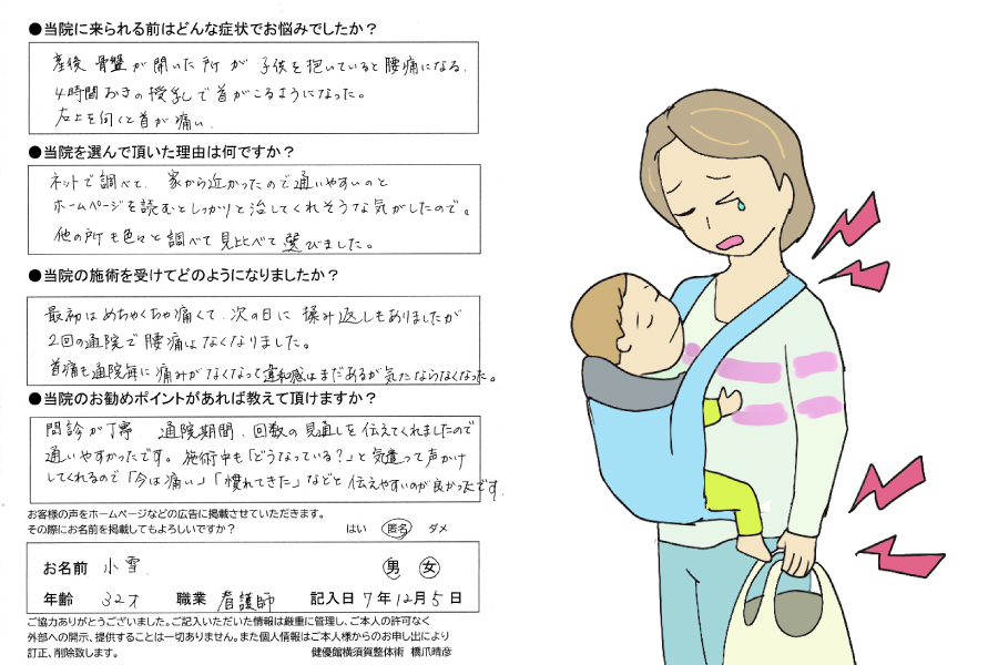 産後の腰痛、首の痛み 32歳 看護師 小雪 横須賀市